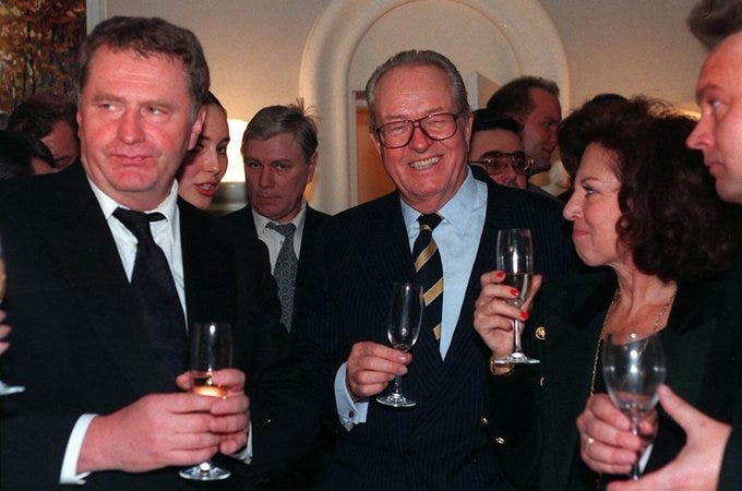 En 1992, Zhirinovsky estableció contacto directo con Le Pen. Limonov actuó como intermediario y el Front National posteriormente facilitó "apoyo logístico" al LDPR (Partido Liberal Democrático de Rusia), incluyendo material informático. Zhirinovsky propuso establecer en Moscú un Centro Internacional de Partidos de Derecha e invitó a Le Pen a visitarle en Moscú. Cosa que el francés hizo con gusto.